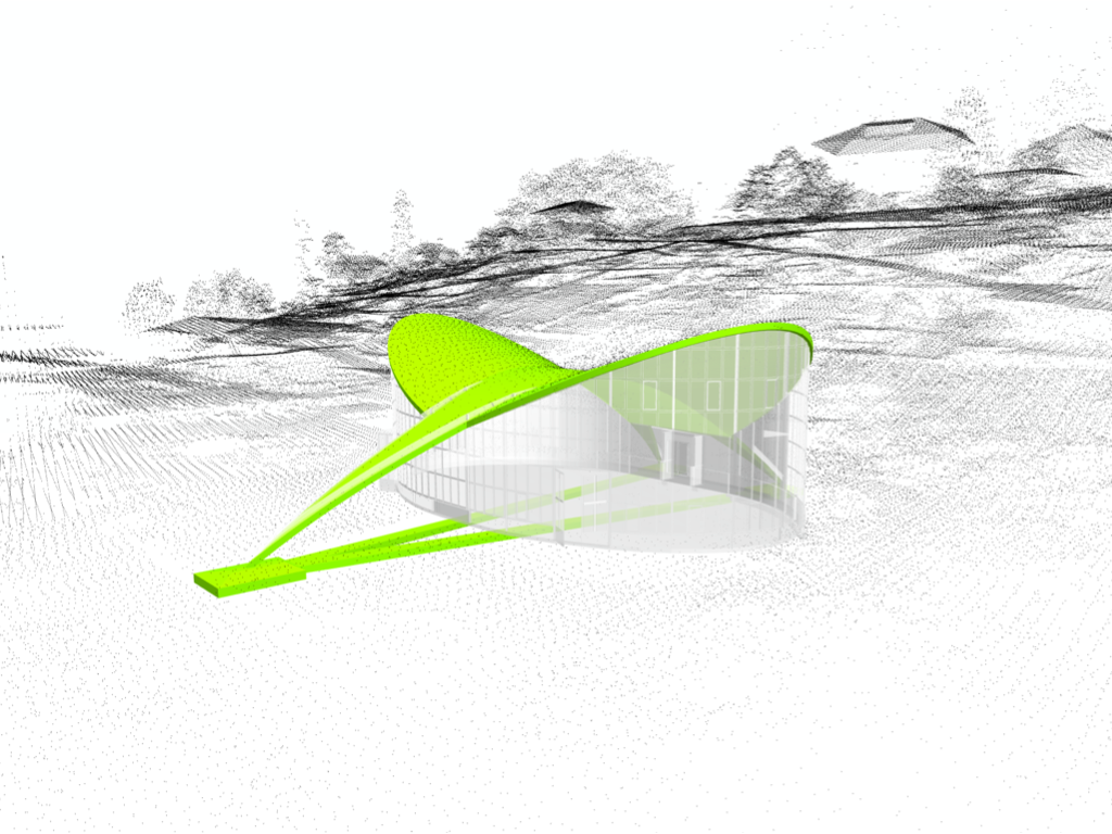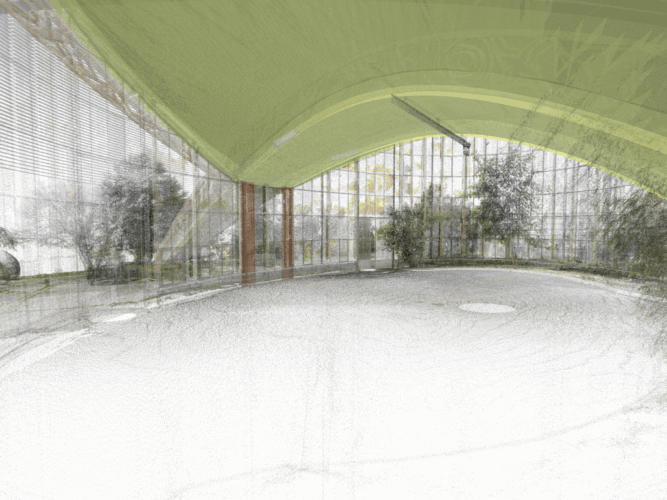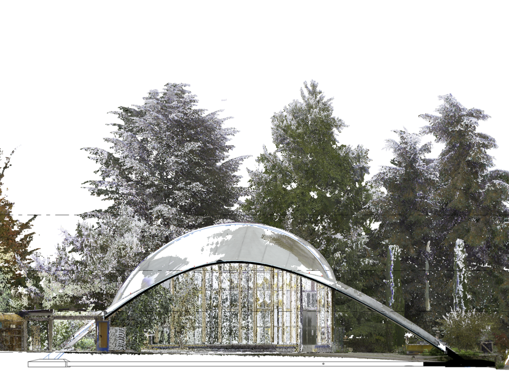 01.5 Digital twin of the Orangerie section through the digital model of the thin-shell structure superimposed on the point clouds. The white pattern on the thin-shell shows the (minimal) imprecision of the model. LiDAR by Ville de Lausanne, Service d’urbanisme.